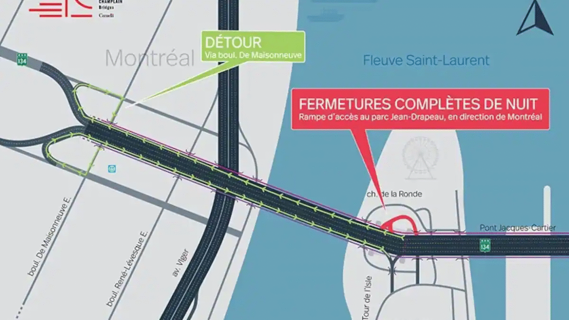 Selon l’organisme, les fermetures toucheront toutes les bretelles d’entrée et de sortie menant au parc depuis Montréal, entre 22h et 5h. Des détours seront mis en place afin de rediriger les automobilistes.